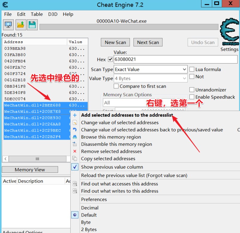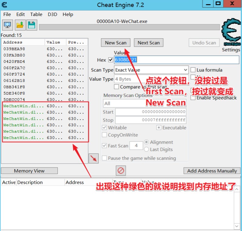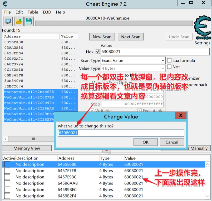 • Hex记得打勾,值填要改的微信版本,就是打开提示低版本的这个版本,换算逻辑点这里:微信版本号转换,我的版本是3.8.0.33,转换过来就是63080021,把这个值填进Hex的值里,再点First Scan
