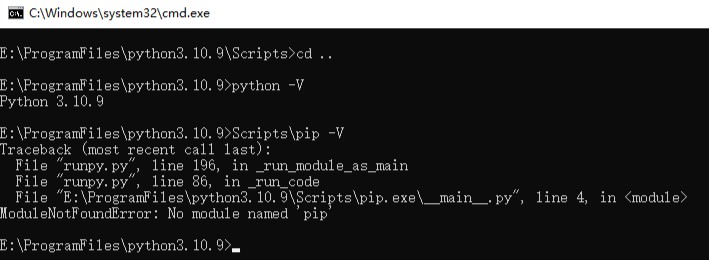 在此路径下打开 cmd 窗口,使用如下命令查看是否安装成功,可以看到 python 版本成功显示,但 pip 版本提示报错,所以还需要解决一下这个报错问题。